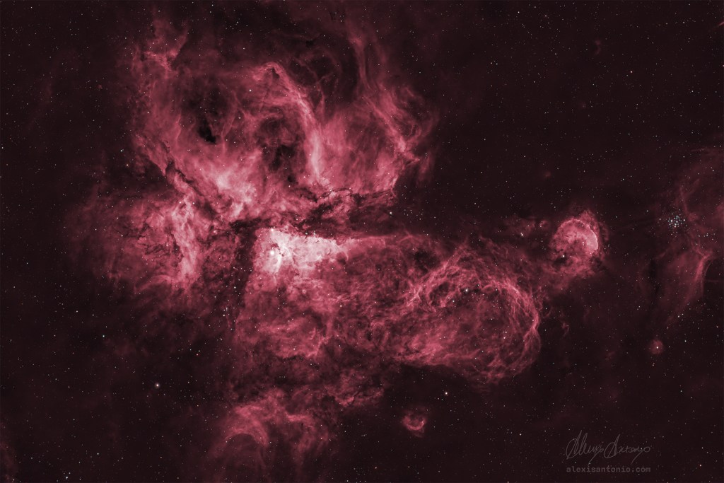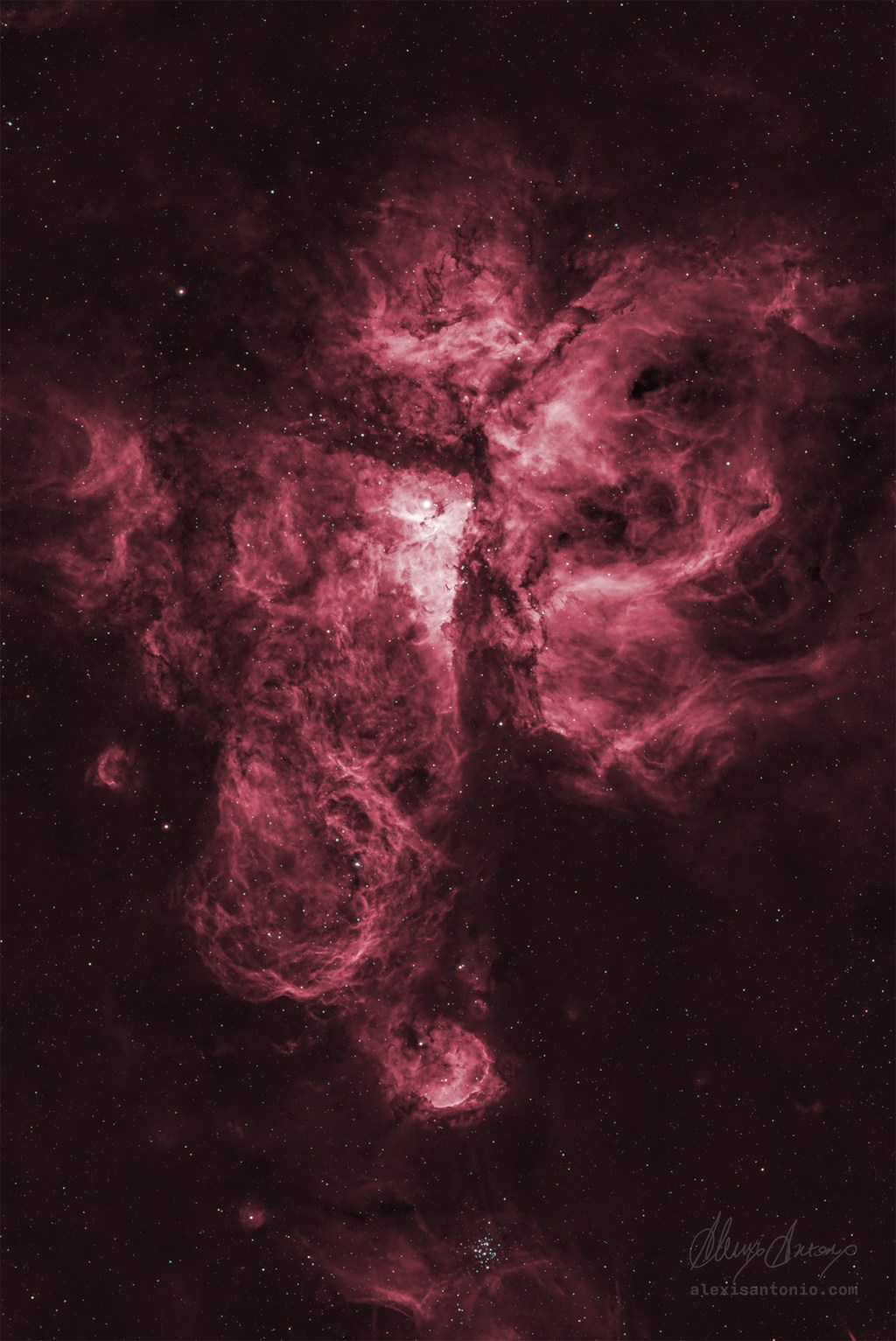 This image was captured exclusively using narrowband filters, which was essential given the extreme low altitude of the Carina Nebula from north Puerto Rico. At transit the target reached only about 11° above the horizon, forcing me to shoot through a very thick column of atmosphere and significant light extinction. Narrowband imaging—especially H‑alpha—allowed me to cut through the atmospheric scattering and isolate the strong emission lines that dominate this nebula.