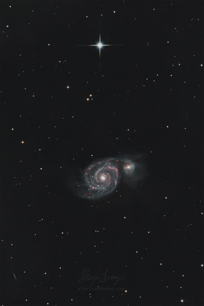 Because the galaxy is rich in H II regions, narrowband filters reveal pockets of hydrogen and oxygen emission that aren’t obvious in broadband alone. This makes M51 a rare galaxy where combining RGB and narrowband data genuinely enhances the story the light is telling.